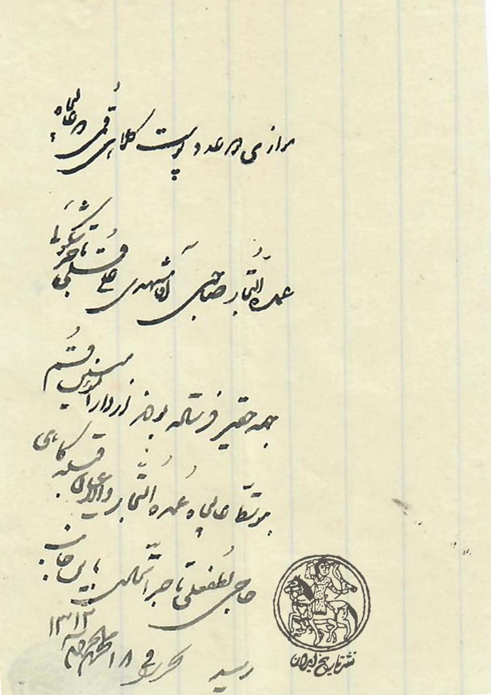 حواله11 مهر 1404برات12 مهر 1404 0 قرارداد اخذ وام حواله تاریخ: ۱۸ محرم ۱۳۱۳قرارداد اخذ وام چهارهزاری از حاج لطفعلی اتحادیه توسط آقا سیدابوالحسن بروجردی تیم مدیریت وب سایت مطالب مرتبط5 آبان 1404وصول حقوقاطلاعات بیشتر دیدگاه ها بسته شده است