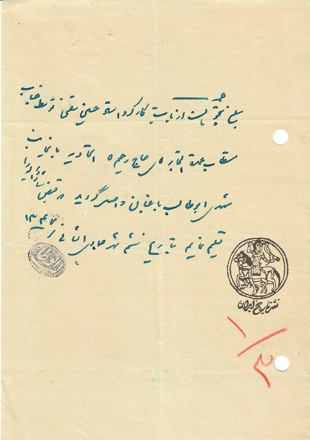 وصول حقوق4 آبان 1404وصول حقالزحمه4 آبان 1404 0 وصول حقالزحمه وصول حقالزحمه تاریخ: ۳ جمادیالثانی ۱۳۴۷وصول مبلغ ۵ تومان از بابت کارکرد استاد حسین مقنی توسط حاج رحیم اتحادیه به مشهدی ابوطالب باغبان برای تسلیم به حسین مقنی تیم مدیریت وب سایت مطالب مرتبط5 آبان 1404وصول حقوقاطلاعات بیشتر دیدگاه ها بسته شده است